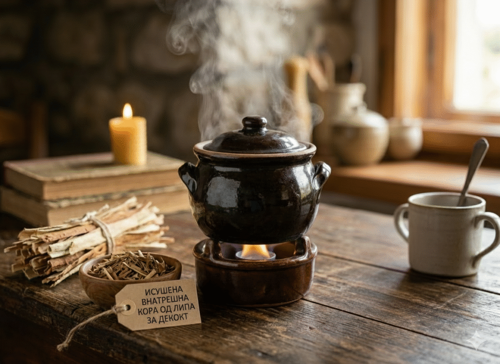 - Подготовка: 40 гр исушена внатрешна кора од липа ставете во 1 литар ладна вода. Варете на тивок оган додека течноста не се преполови (да остане околу 500 мл).