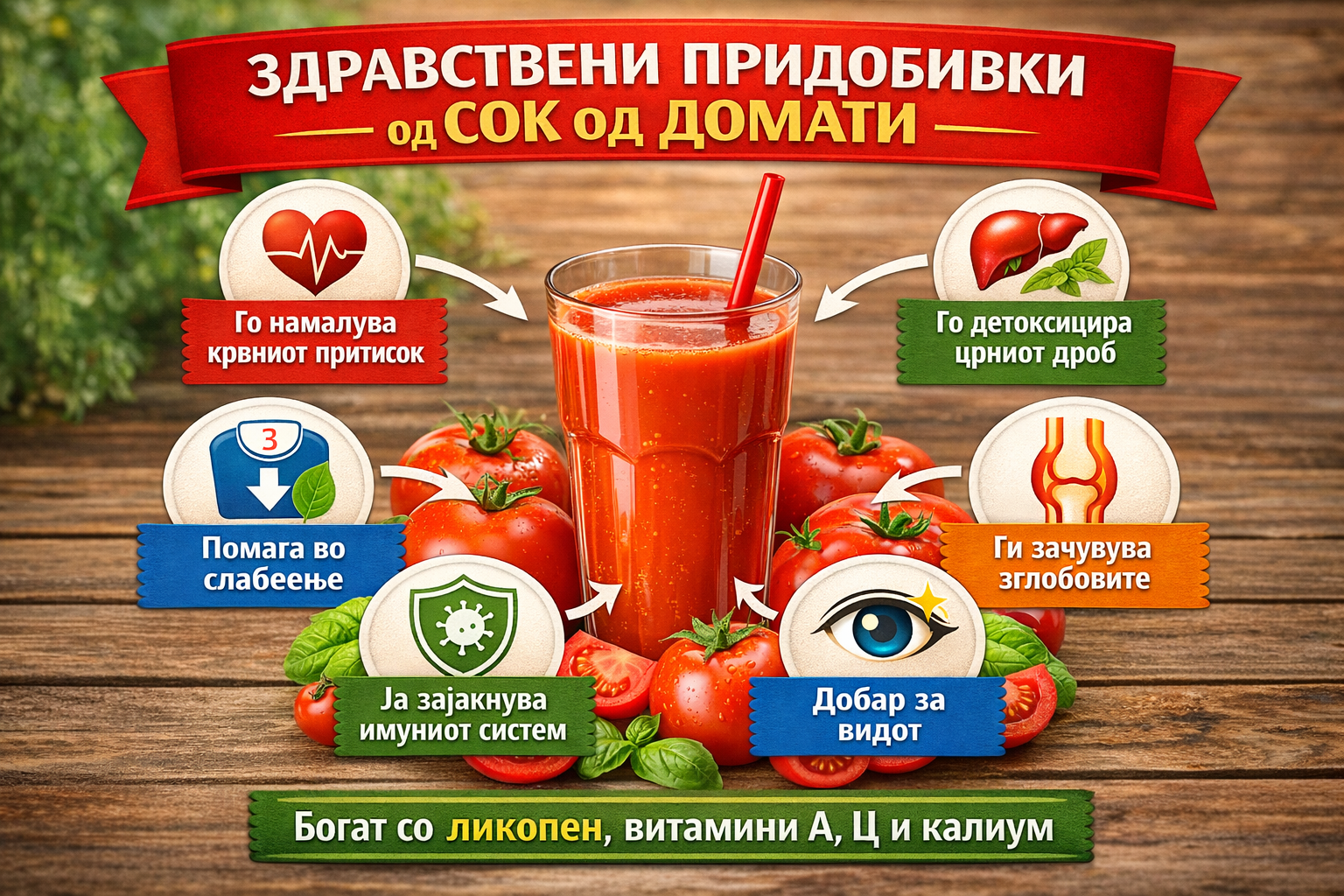 Чаша свеж доматен сок нуди изобилство од антиоксиданси како ликопен, витамин Ц и калиум. Овој црвен еликсир делува освежително и истовремено штити од секојдневните здравствени предизвици. Научни студии, како финската со над 1.000 мажи, покажуваат дека редовното консумирање на сок од домати го намалува ризикот од мозочен удар за дури 55%. Ликопенот спречува згрутчување на крвта и ги одржува крвните садови здрави. Кај проблеми со висок крвен притисок, витаминот Б6 во доматите го намалува хомоцистеинот и го штити срцето од оштетувања.